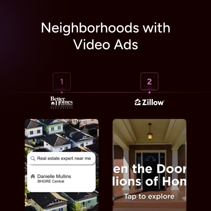 For instance, Better Homes and Gardens® Real Estate utilizes a video ad with the message, "Discover the charm of the neighborhood. Explore homes and connect with a local expert," while Zillow features a video ad stating, "Open the door to millions of homes. Find your perfect neighborhood."