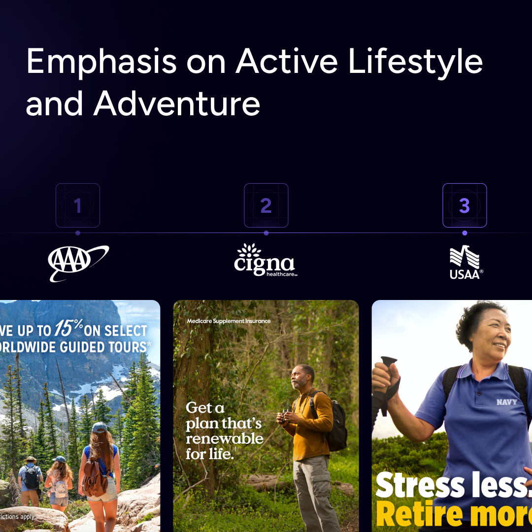 Across all 24 analyzed insurance companies, the visual use of Leisure Activities in images was one the most common visual used in ad asset images. Below you'll find key common strategies used across ad images.