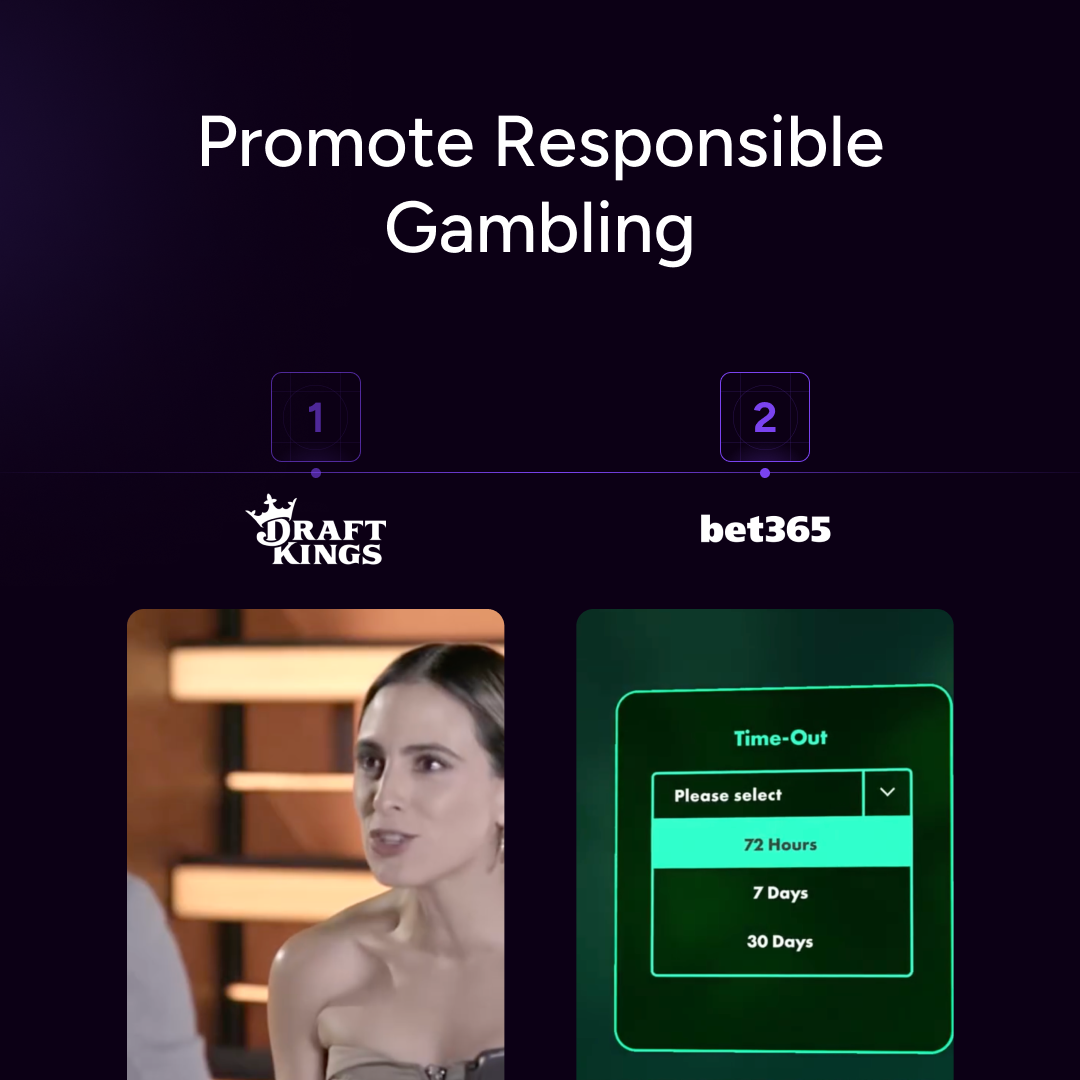 For example, DraftKings Sportsbook’s video ad, “Set limits. Stay in control. Have a gambling problem? Call 1-800-GAMBLER,” emphasizes the importance of self-discipline. Meanwhile, Bet365’s ad, “Play safe with Bet365’s safer gambling tools. Set limits and take breaks,” offers practical tips for maintaining control.