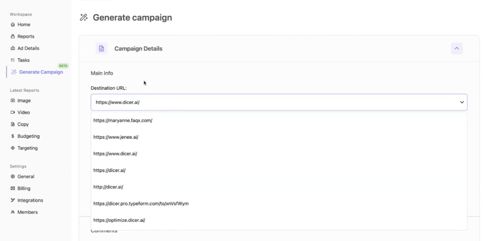 Begin by clicking on “Generate Campaigns” to start building your next LinkedIn campaign. Then, either plug in a new URL or select an existing one from your list.