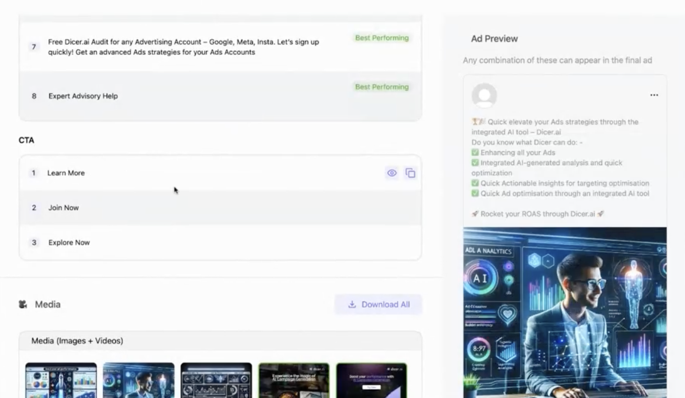 Examine the recommended settings, targeting options, visuals, and ad copy. Check the previews of your ads to ensure they align with your vision. Once satisfied, download and upload the assets with ease.