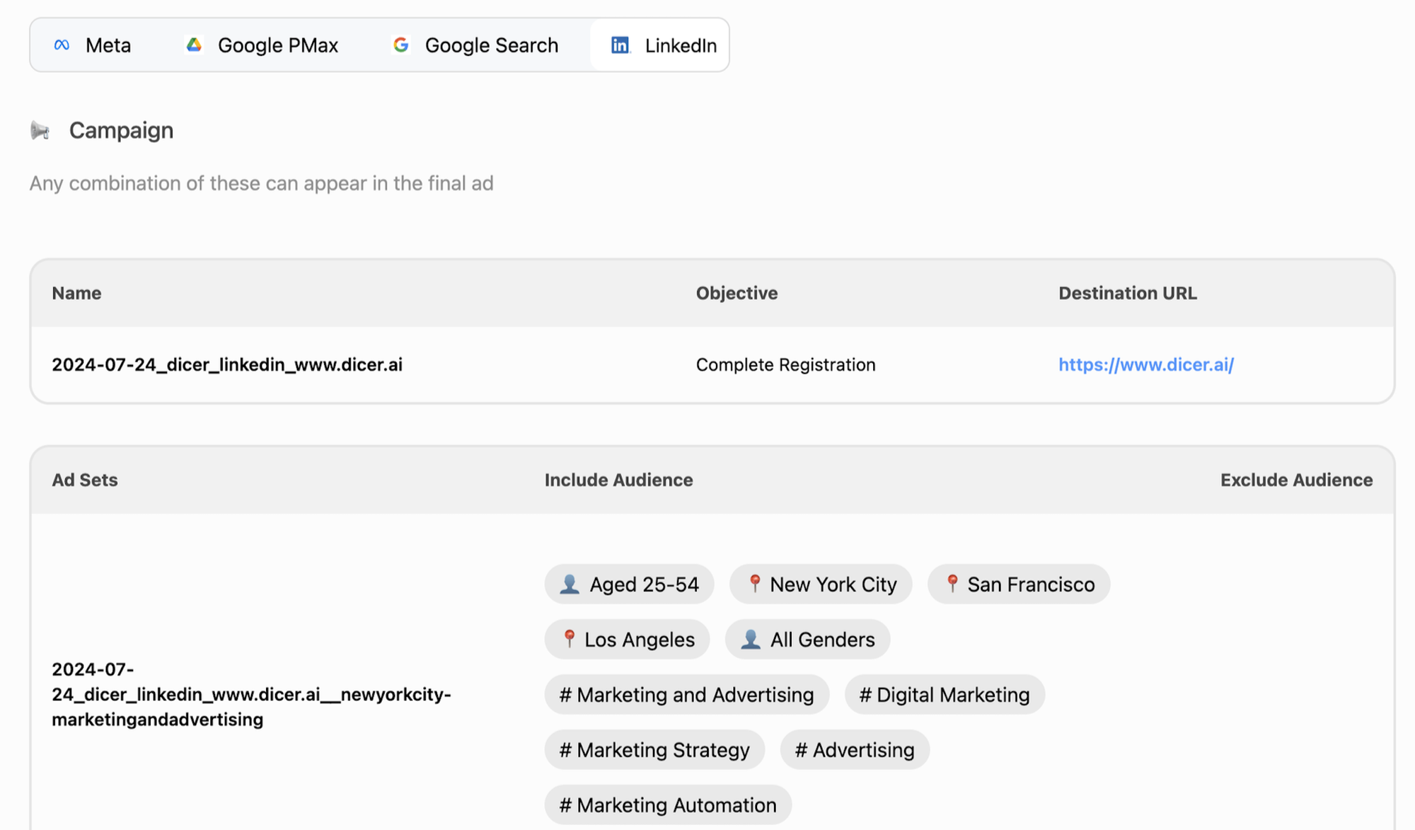 Our new feature now includes tailored outputs for LinkedIn, alongside Meta, Google Performance Max, and Google Search. This means your LinkedIn campaigns will benefit from specific recommendations and optimizations, enhancing your outreach on this key platform. Review the tailored settings and recommendations for each platform to ensure each is fine-tuned to maximize your campaign’s effectiveness.