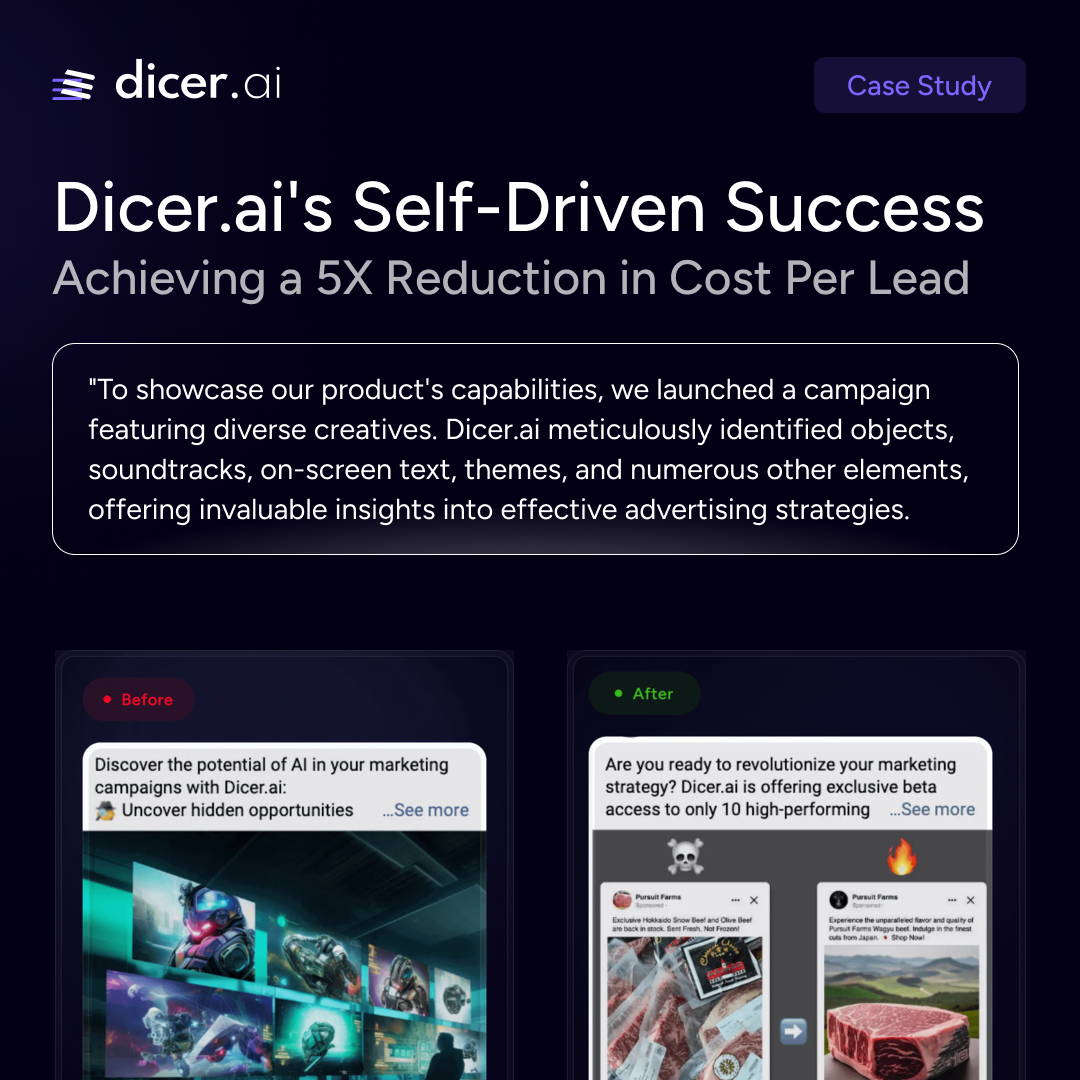 At Dicer.ai, we practice what we preach. Using our own platform, we optimized our ad campaigns and achieved remarkable cost efficiencies. Achieving a 5X reduction in cost per lead. By leveraging Dicer.ai's AI capabilities, we not only saved costs but also freed up valuable resources to focus on strategic growth initiatives.